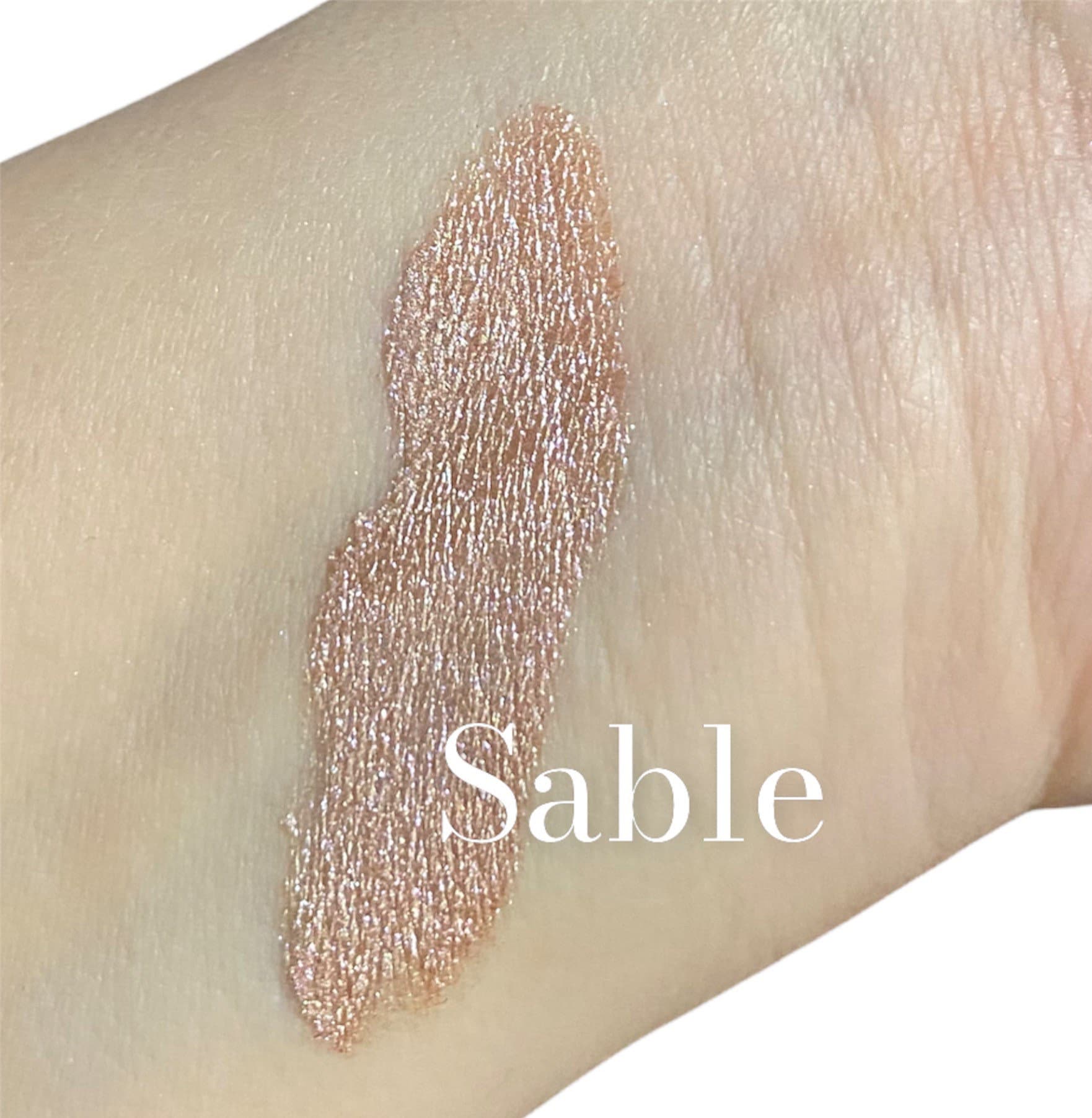 Sable mineral eye shadow has silver and pink sparkle, medium luster and shimmer, a pale crystal pink with mauve brown tones. Goes on smooth and stays all-day, we know we tested it.